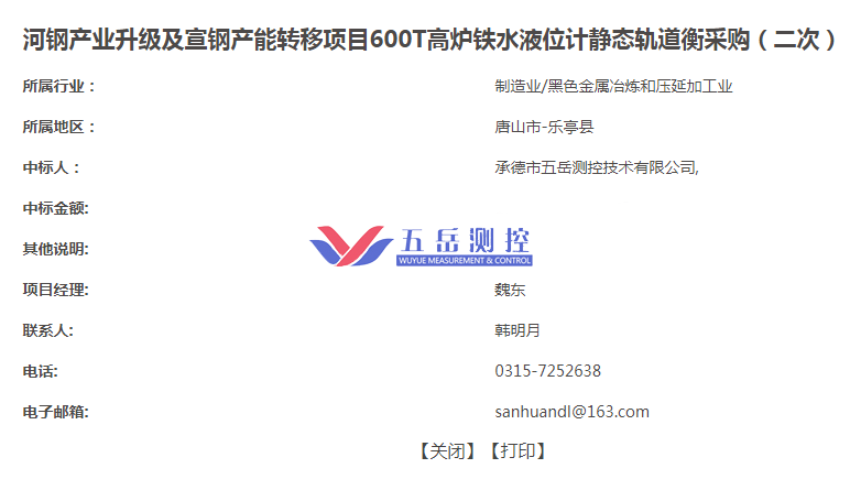 近日,承德市五岳測控技術(shù)有限公司中標(biāo)河鋼產(chǎn)業(yè)升級及宣鋼產(chǎn)能轉(zhuǎn)移項(xiàng)目600T高爐鐵水液位計靜態(tài)軌道衡采購項(xiàng)目。合同臺數(shù)24臺; 項(xiàng)目合同的最終簽訂對整個公司以后業(yè)務(wù)推廣、拓寬市場具有重要的意義,不僅展示了公司的實(shí)力同時也展示了公司的核心競爭力。在此,我們對為該項(xiàng)目